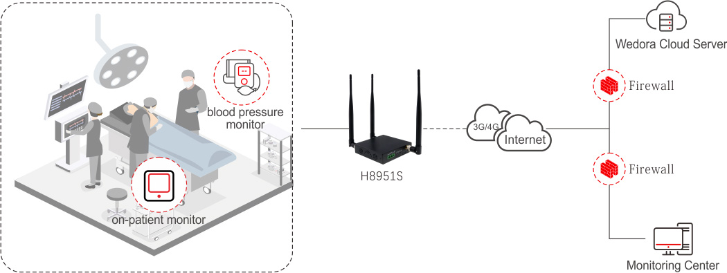H8951S is the perfect choice for this solution. Since it includes a variety of different components using wired and wireless connections, it needs to have a wide range of connectors and interfaces to integrate everything into a fully functional system that can be monitored remotely. This highly secure and reliable industrial router is equipped with Ethernet, RS232, RS485, and Wi-Fi. The rich interfaces make it possible to network medical equipment, and all of these can be easily managed through our remote management system (RMS).